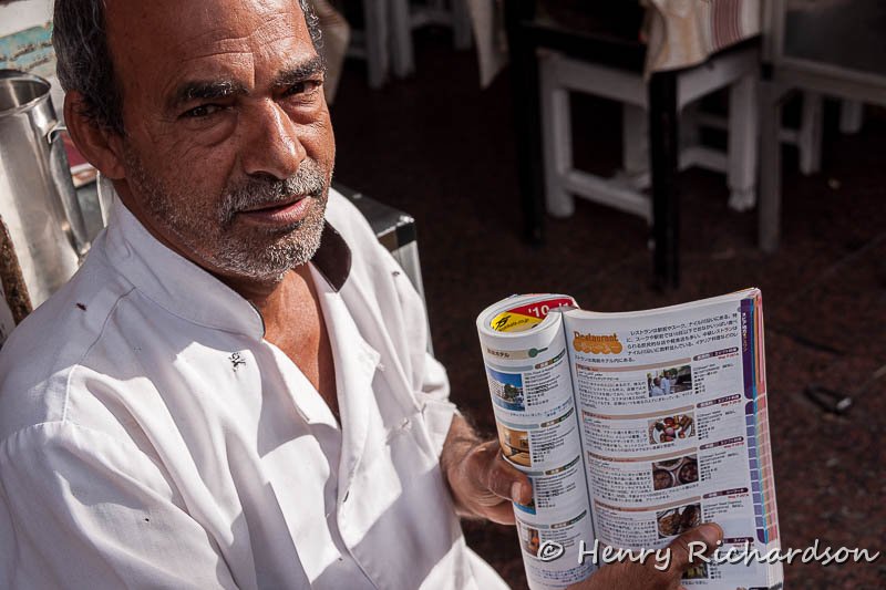 | Excited small restaurant owner because he sees his photo in a Japanese travel guide, Aswan |
