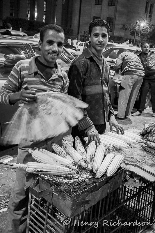 Roasting corn on the street at night, Cairo