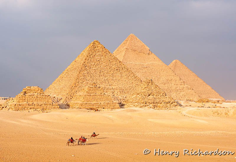 | Pyramid of Menkaure, Pyramid of Khafre, Pyramid of Khufu (Cheops) with 3 small Queens' Pyramids in front, Giza |