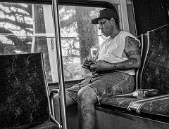 Counting his cash on the bus, 2018