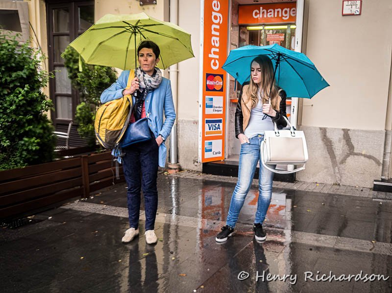 Trying to stay dry on a rainy day, Budapest, 2015