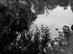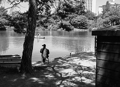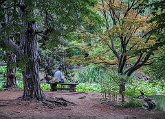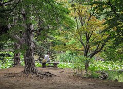 Contemplating the pond at Akarengo, Sapporo, 2015