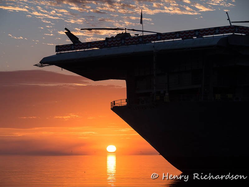 USS Lexington, historic WWII aircraft carrier, at sunrise |
