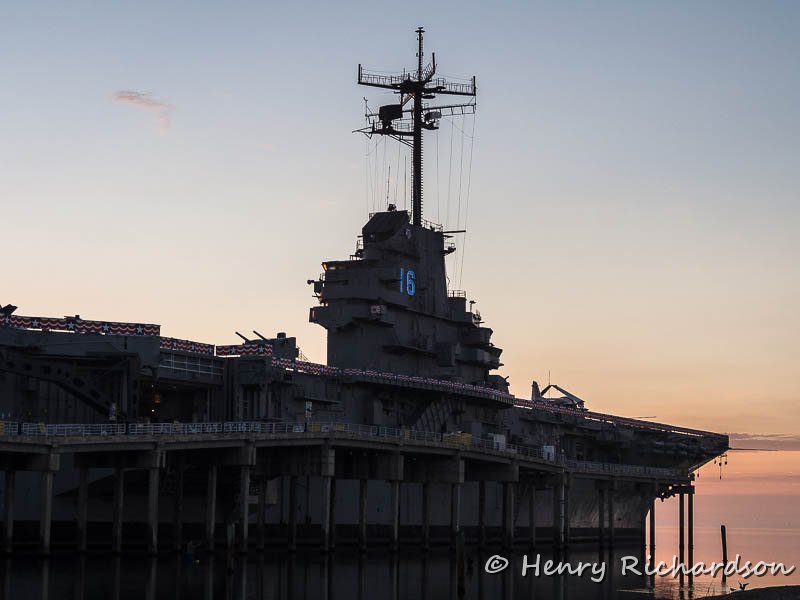 USS Lexington, historic WWII aircraft carrier, at sunrise