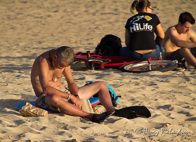 | He is so pooped he has forgotten to take off his flippers and fell asleep while reading. |