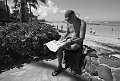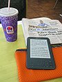 Kindle, Honolulu newspaper, and a cold drink