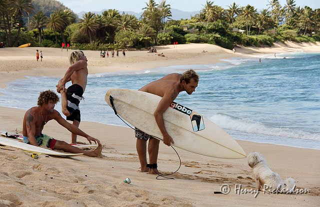 Surfers with dog at Sunset Beach