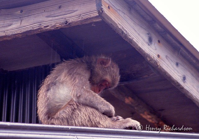 | Monkey sleeping under the eave of a house on a rainy day on a small island, 1990 |