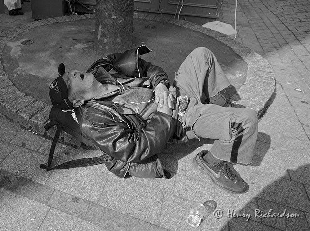 | Passed out drunk after drinking shochu (shochu glass there next to him), Shinjuku, Tokyo, 2012 |