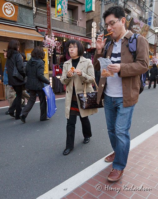 | Eating fresh senbei, Sugamo, Tokyo, 2012 |