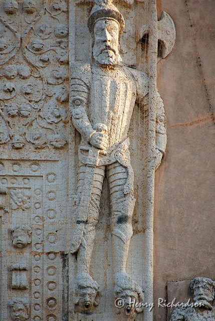 | Conquistador standing on the heads of conquered Indians, Casa de Montejo (built in 1549) in Mérida |