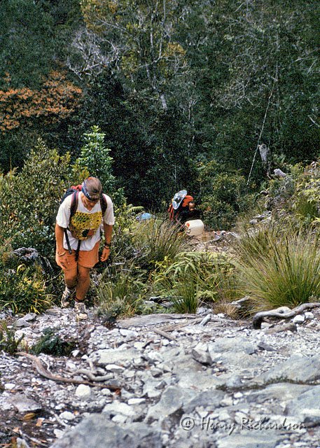| Angela slogging up out of one of the endless number of steep ravines, 1995 |