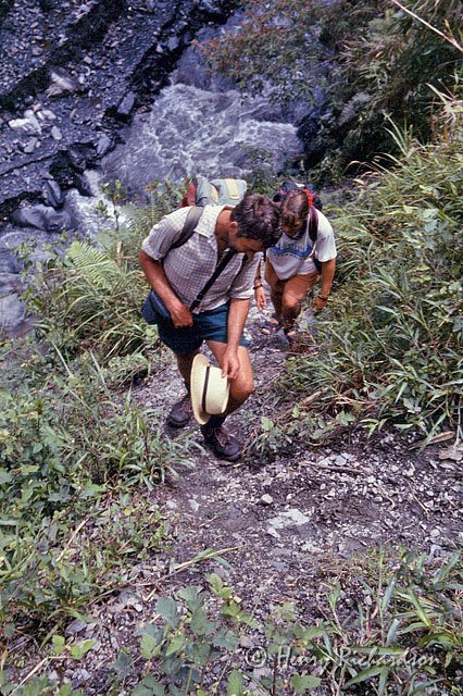 | Garry and Angela slogging up out of one of the endless number of steep ravines, 1995 |