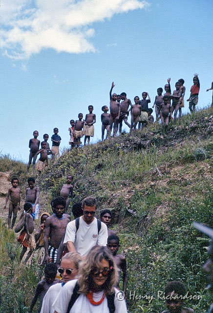 | Passing through a village in the highlands on the trek and getting a nice send-off from the Lani children, 1995 |