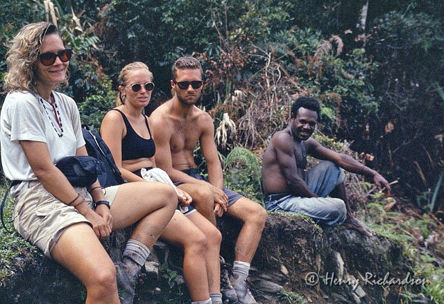 | Chelsea, Jeff, Stephanie, and porter resting on the trail, 1995 |