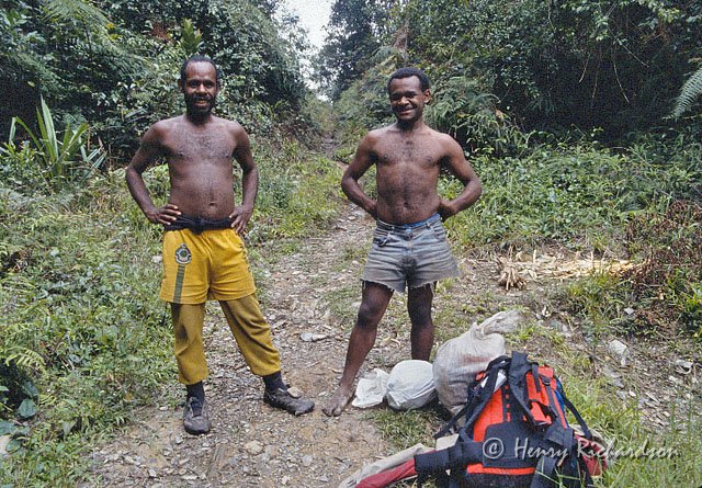 | My porter Gupy (in yellow) with another porter on the trail, 1995 |